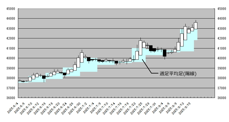 平均足始値=41,774.45/平均足終値=43,598.14で、13週線=40,189.51を大きく上回る推移。