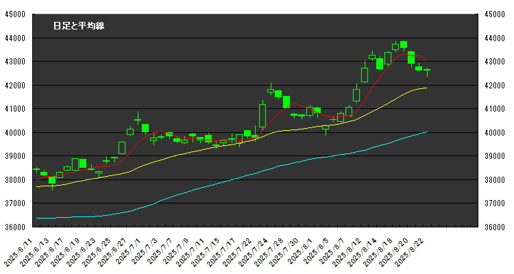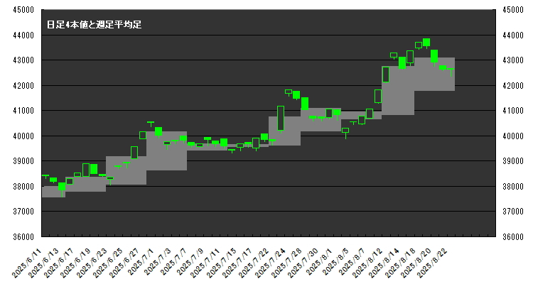 8月22日、日経平均は42,633円29銭で小反発したが、日足の平均足は陰転3本を維持し、ATR14≒645円までボラが拡大している。