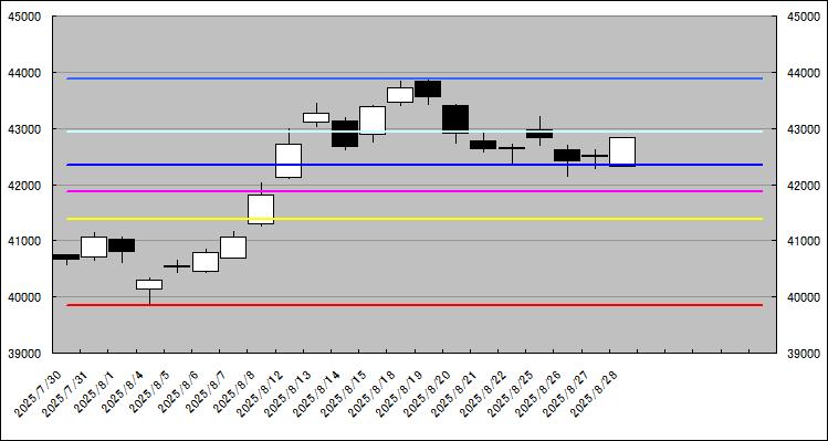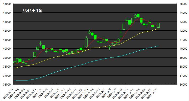2025年8月28日の日経平均株価は42,828円と反発して引けた。