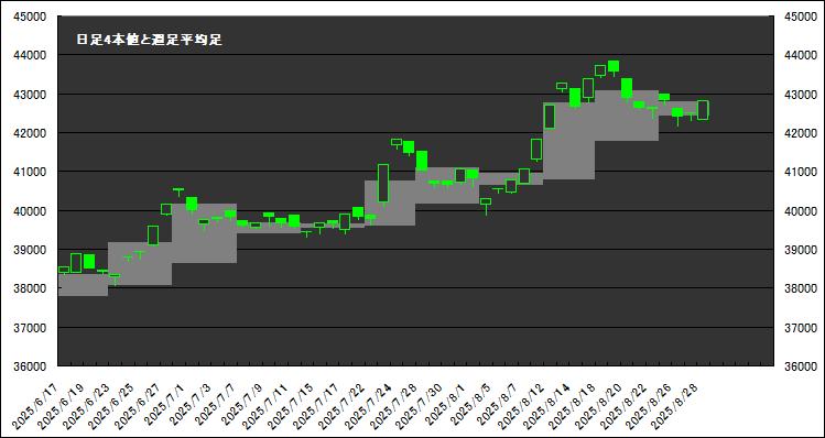 週足平均足では始値42,423円、終値42,786円となり、陽線基調が維持されている。