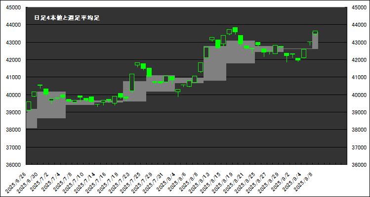週足もHA始値:42,600円・HA終値:43,569円で陽線を維持しており、押し目は浅くなりやすい地合いだ。