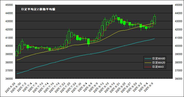 日足平均足はHA始値:42,636円・HA終値:43,569円・高値:43,839円・安値:43,344円で明確な陽線。