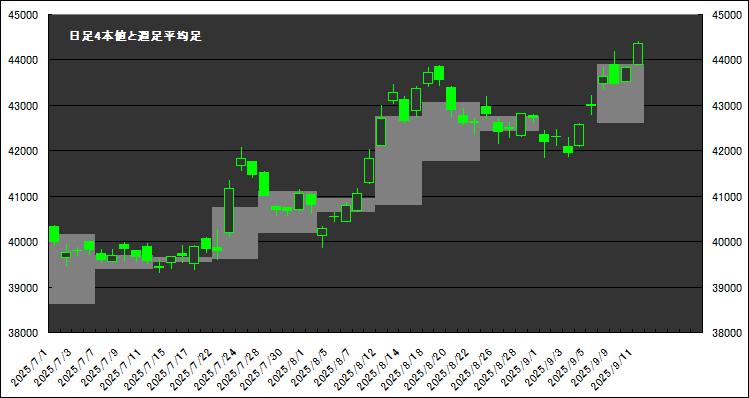 日足平均足はHA始値=43,552/HA終値=44,129/高値=44,396/安値=43,871で陽線。