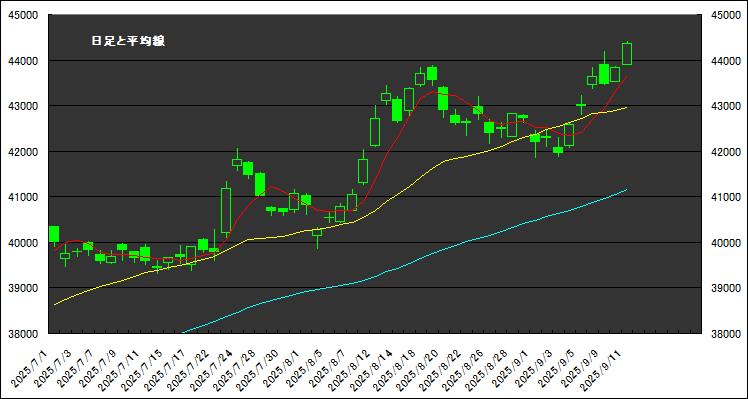 2025年9月11日、日経平均は44,372.50円(+534.83)と続伸し、直近スイング高値43,876円を陽線で明確に突破した。