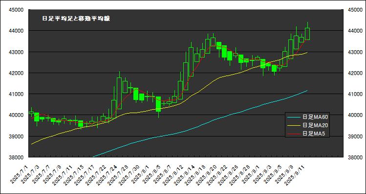 移動平均は5日線=43,666円/20日線=42,970円/60日線=41,154円。